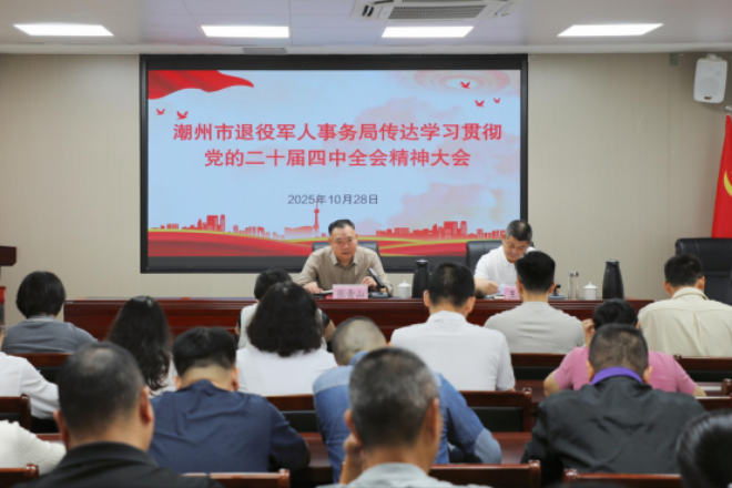 潮州市退役军人事务局召开党组(扩大)会,传达学习党的二十届四中全会精神及省委常委会(扩大)会议、市委常委会(扩大)会议精神,研究贯彻落实意见。局党组书记、局长张青山主持会议并讲话。