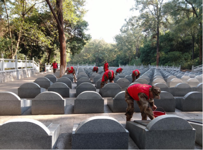 11月25日,韶关市南雄市革命烈士陵园内阳光和煦,10名身着退役军人志愿服务队马甲的老兵,开展了一场以“守护英灵净土、传承红色精神”为主题的公益行动。他们分工协作,对园区内的白色垃圾进行全面清理,并逐一擦拭烈士墓碑,用实际行动表达对革命先烈的深切缅怀与崇高敬意。