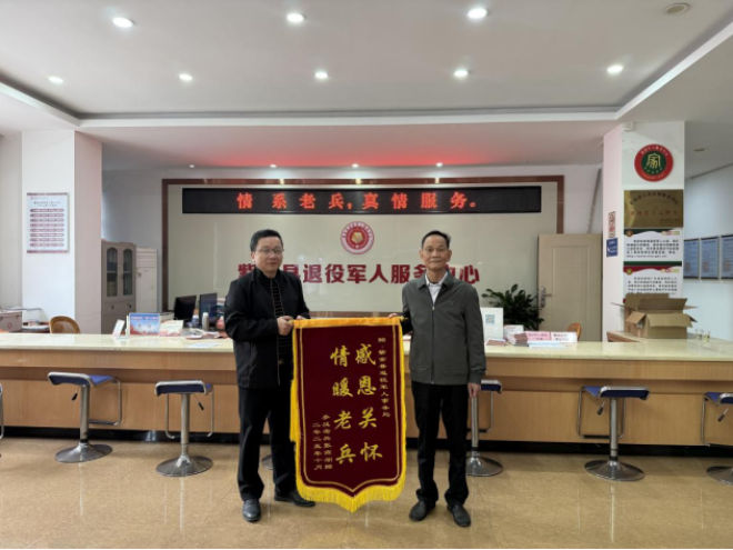 近日,退役军人张燕湖将一面印有“感恩关怀 情暖老兵”的锦旗送至河源市紫金县退役军人事务局,表达对工作人员热情服务和为其成功申请省退役军人应急救助资金、缓解家庭困难的感激之情。