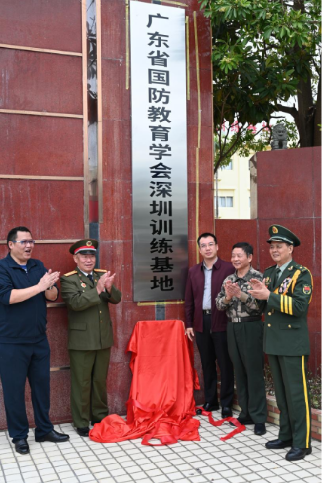致辞环节结束后,进入揭牌环节。在主持人的引导下,全体人员步行前往基地大门口就位,伴随着国防专用教具发射中的震撼声响,领导们共同为基地门口的牌匾揭开红绸,标志着广东省国防教育学会深圳训练基地正式启用,现场掌声雷动,气氛热烈。