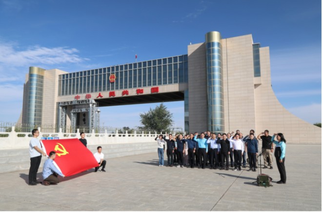 在庄严肃穆的国门广场,全体党员面向党旗,庄严举起右拳,重温入党誓词。铿锵有力的誓言回荡在边防线上,一字一句,铭刻着初心与忠诚,进一步坚定了理想信念、筑牢了精神根基。